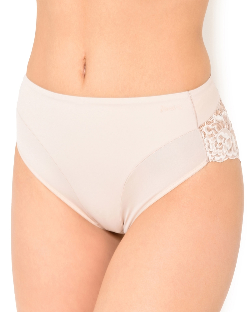 Трусики слипы молочного цвета, со средней линией талии и средним боком. Передняя деталь выполнена из гладкого эластичного полотна с микрофиброй, задняя - из эластичного кружевного полотна с цветочным рисунком, за счет специального кроя, мягко обхватывающим и приподнимающим ягодицы, образуя эффект «танга». Верхний срез и срез проймы передней детали обработан плоским швом. Срез проймы задней детали кружевной.
