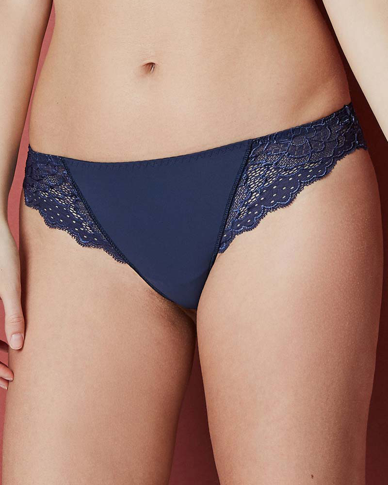 Эффектные трусики-танга глубокого, синего оттенка с нежным кружевом сзади.