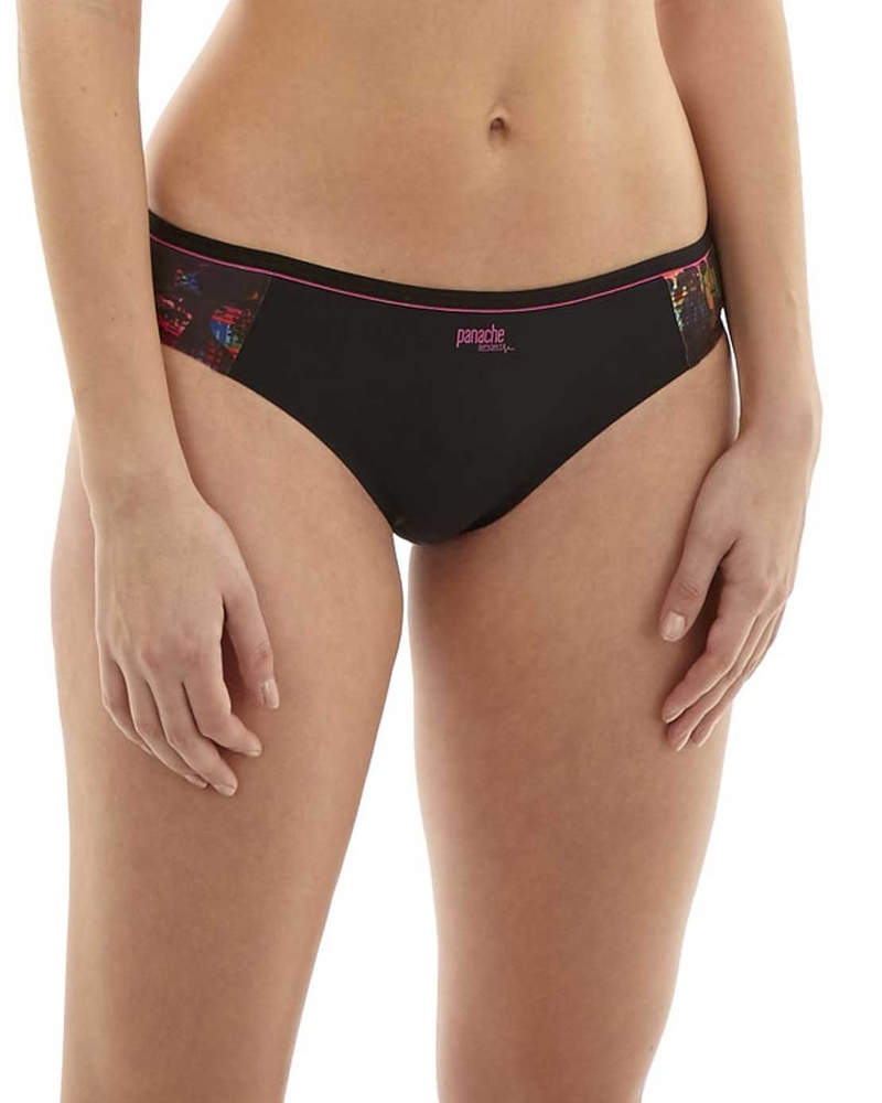 Классические чёрные трусики с цветной вставкой на боках. Модель выполнена из мягкой, эластичной ткани, которая хорошо отводит влагу и садится по фигуре.